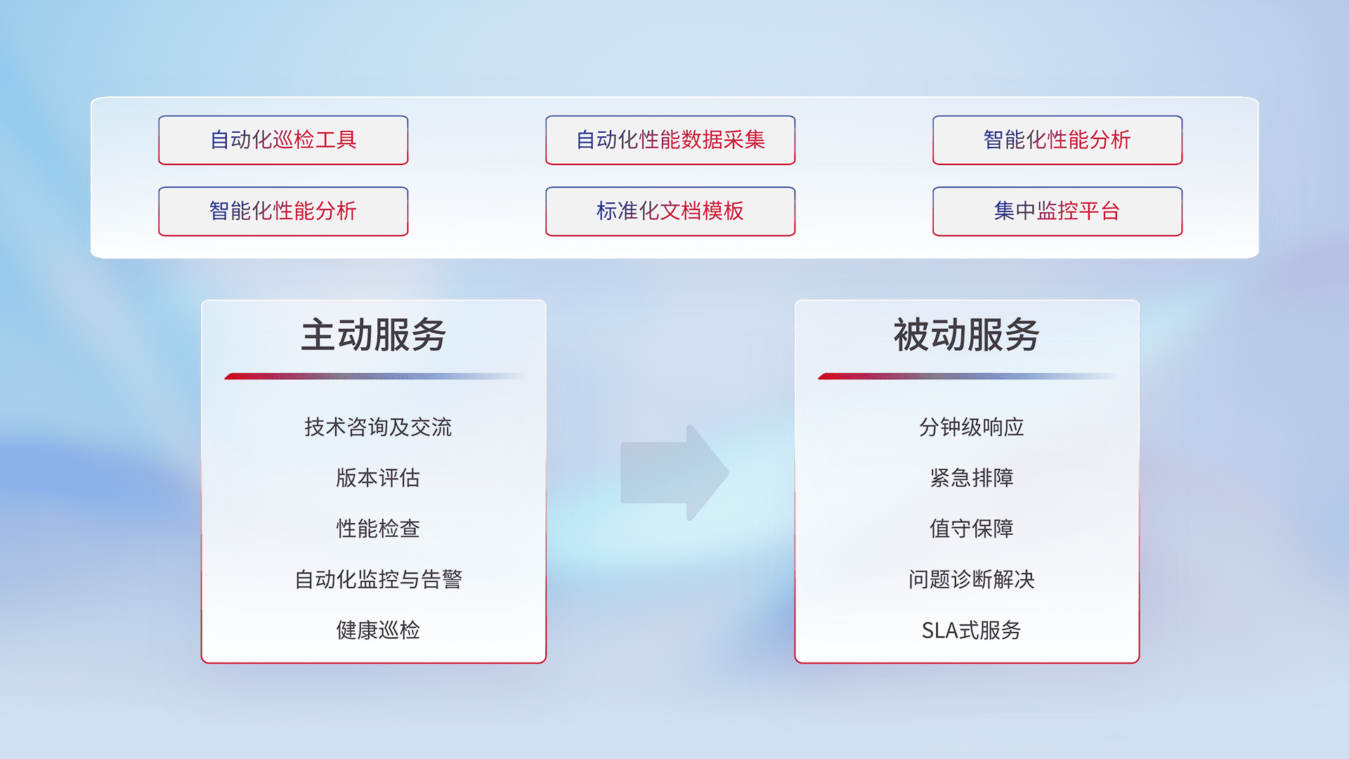 智能化工具和标准化文档,,,保障服务质量,,,,提供主动服务(包含技术咨询、、、、版本评估、、、、性能检查、、、自动化监控与告警、、、、健康巡检)和被动服务包含(分钟级响应、、、紧急排障、、值守保障、、问题诊断解决、、、、SLA服务)。。。。